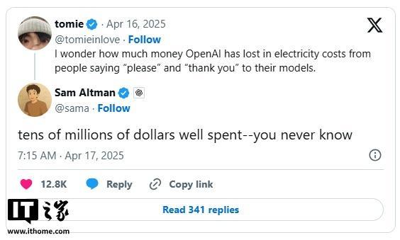 IT之家注意到,OpenAI 首席执行官萨姆・奥尔特曼(Sam Altman)公布了一个惊人的事实:仅为了处理用户日常的寒暄和礼貌性交流,就需要投入“数千万美元”的巨额预算。这些看似微不足道的对话,如“谢谢”“请”等礼貌用语,虽然在情感上让我们与 AI 的互动显得更加人性化,但其背后却涉及到高昂的能源消耗。最新报告指出,即使是像“不客气”这样短短三个字的回复,大型语言模型(LLM)也需要消耗大约 40-50 毫升的水。