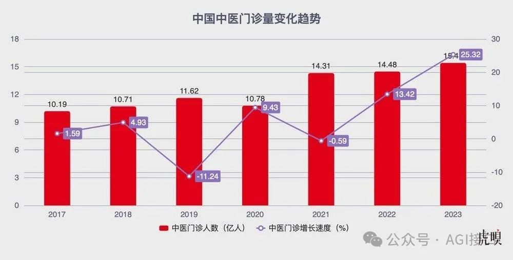 中医历来奉行著「上医治未病」的古训,在当今社会中,人们对健康的关注日益加强,中医需求的增长趋势也日益明显。行业统计数据表明,自2022年以来,中医门诊在医疗机构中的增长速度都保持在10%以上,2023年更是突破25%,服务总量达到了近百万亿元,远超之前的水平。中医馆和中医诊所的注册数也在快速上涨。