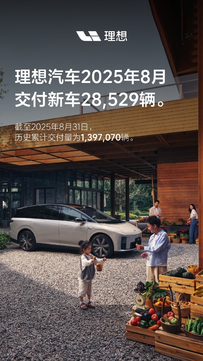 科技讯 9月1日,理想汽车今日公布2025年8月交付数据。根据最新统计,2025年8月,理想汽车成功交付新车28,529辆,这一成绩再次证明了其在中国汽车市场上的强劲竞争力。截至2025年8月31日,理想汽车历史累计交付量已达1,397,070辆,这一数字也再次证明了其在汽车行业的可靠性和成长潜力。