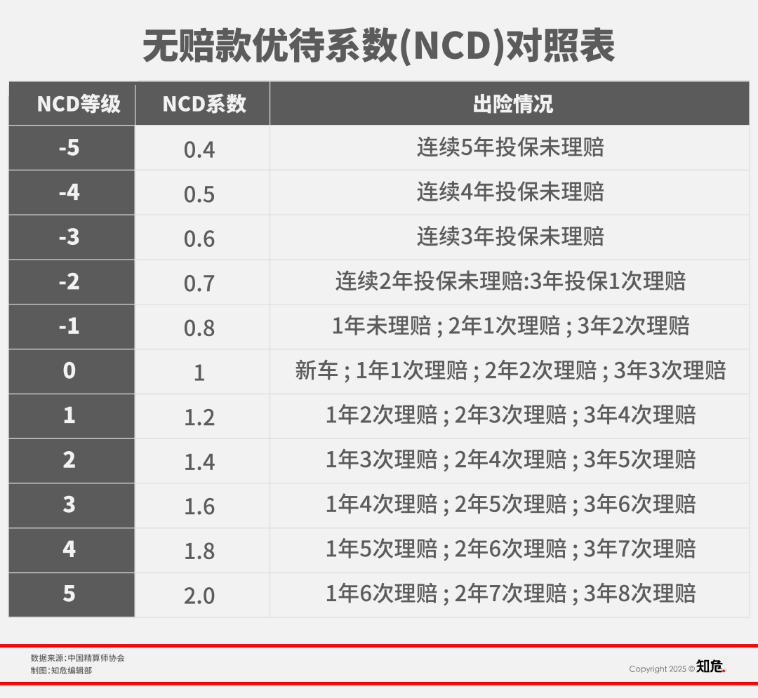 在这个公式中,无赔款优待系数(NCD系数,no-claim discount)是商业险中为数不多与车主驾驶行为直接挂钩的变量。该系数基于车辆历史出险记录,动态调整保费的奖惩机制,不同保险公司执行统一标准,旨在通过“奖优罚劣”实现风险与成本的匹配。