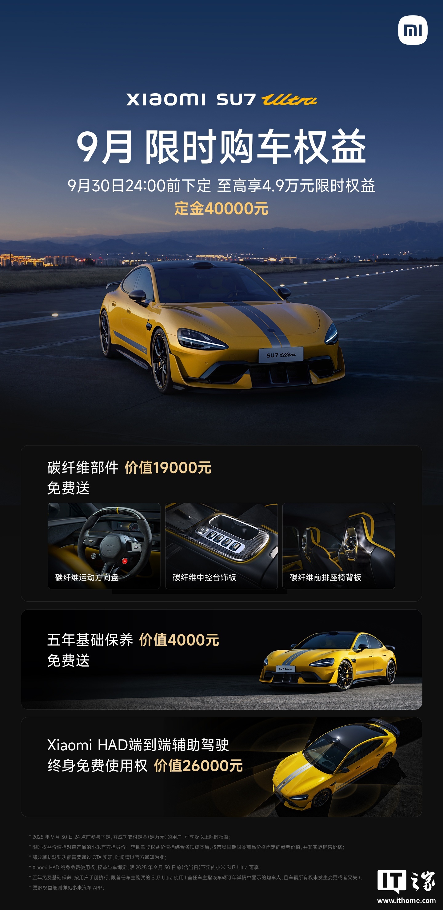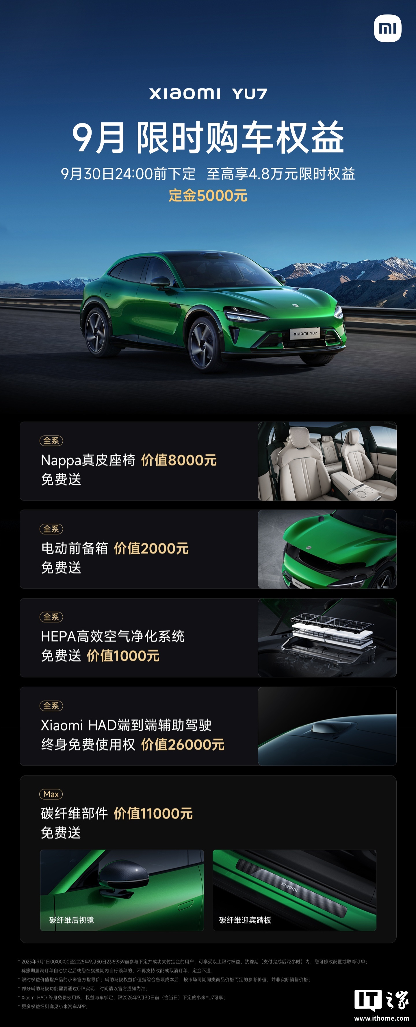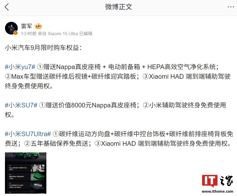 IT之家9月1日讯,小米创始人、董事长兼CEO雷军今日发布了小米汽车9月限时购车权益,其中YU7、SU7、SU7 Ultra的权益均包含额外的辅助驾驶终身免费使用权益。