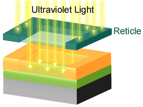 这是光刻的灵魂步骤。 一束紫外光穿过名为掩模版(Reticle)的“底片”,上面刻有放大版的电路设计图,接着经过一系列复杂镜片的缩小和聚焦,精准地“投影”设计图案到光刻胶上。