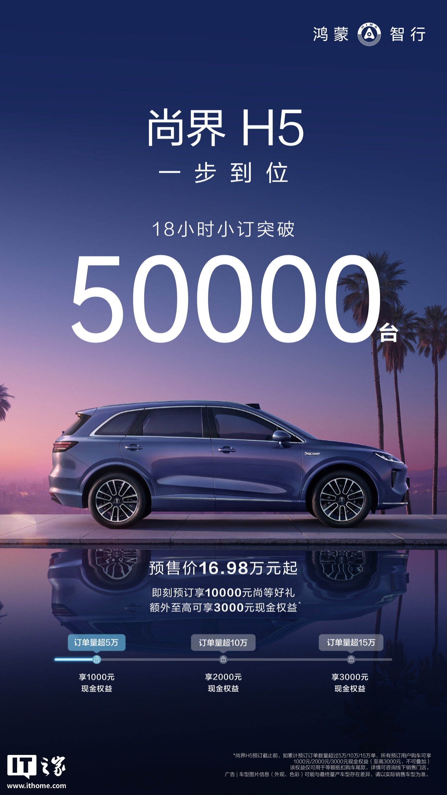 根据IT之家的最新报道,尚界H5已经启用小订,官方最新数据显示,新车18小时小订的销售额已经突破50,000台,并且解锁了第一档现金权益,即尾款立减1,000元。由于尚界汽车官方暂未公布新的小订数据,因此可以推测,该车小订暂时还没有达到10万台的销售额。