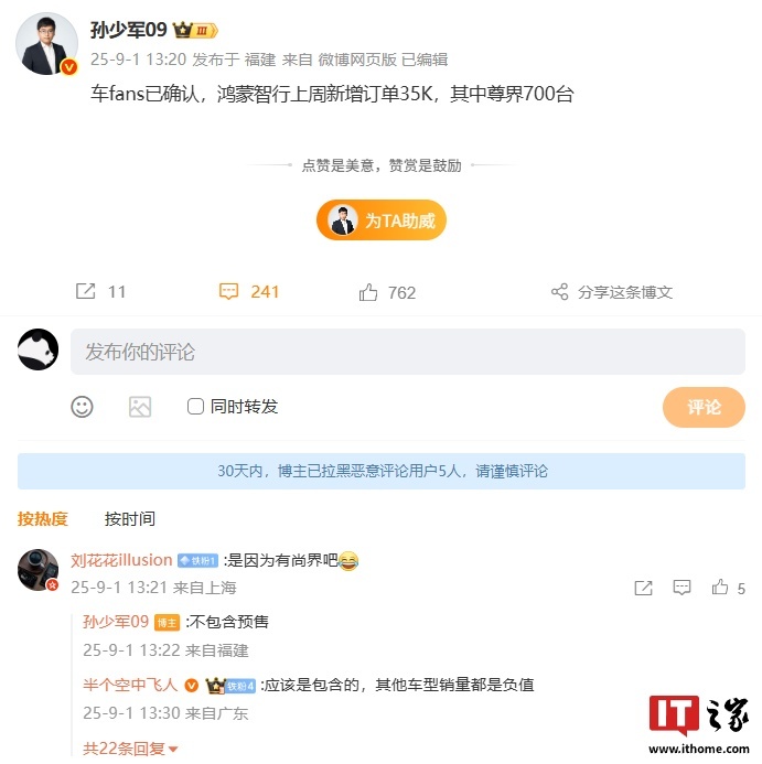IT之家9月1日消息,博主@孙少军09今日发文透露,鸿蒙智行上周新增订单35,000台,其中尊界有700台。