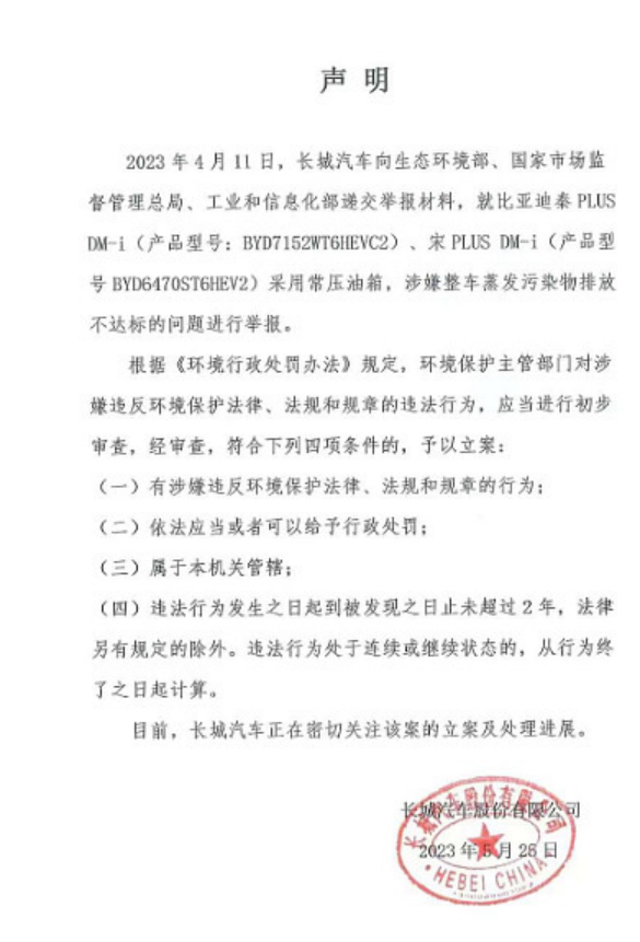 虽然长城和比亚迪之间,单从业务上来看,冲突的领域相对较少,但是这两家的暗流已经潜伏很久了,就像2023年,长城汽车举报比亚迪王朝系列车型排放不达标一样,而比亚迪当时则直接回应称“长城汽车的举报是一种不正当的竞争行为”。