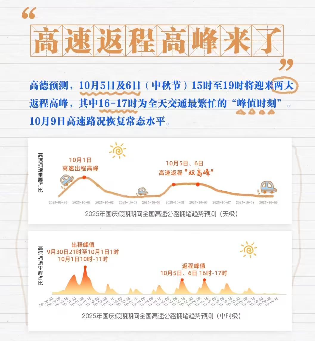 高德预测:10月5日及6日15时至19时将迎来两大返程高峰