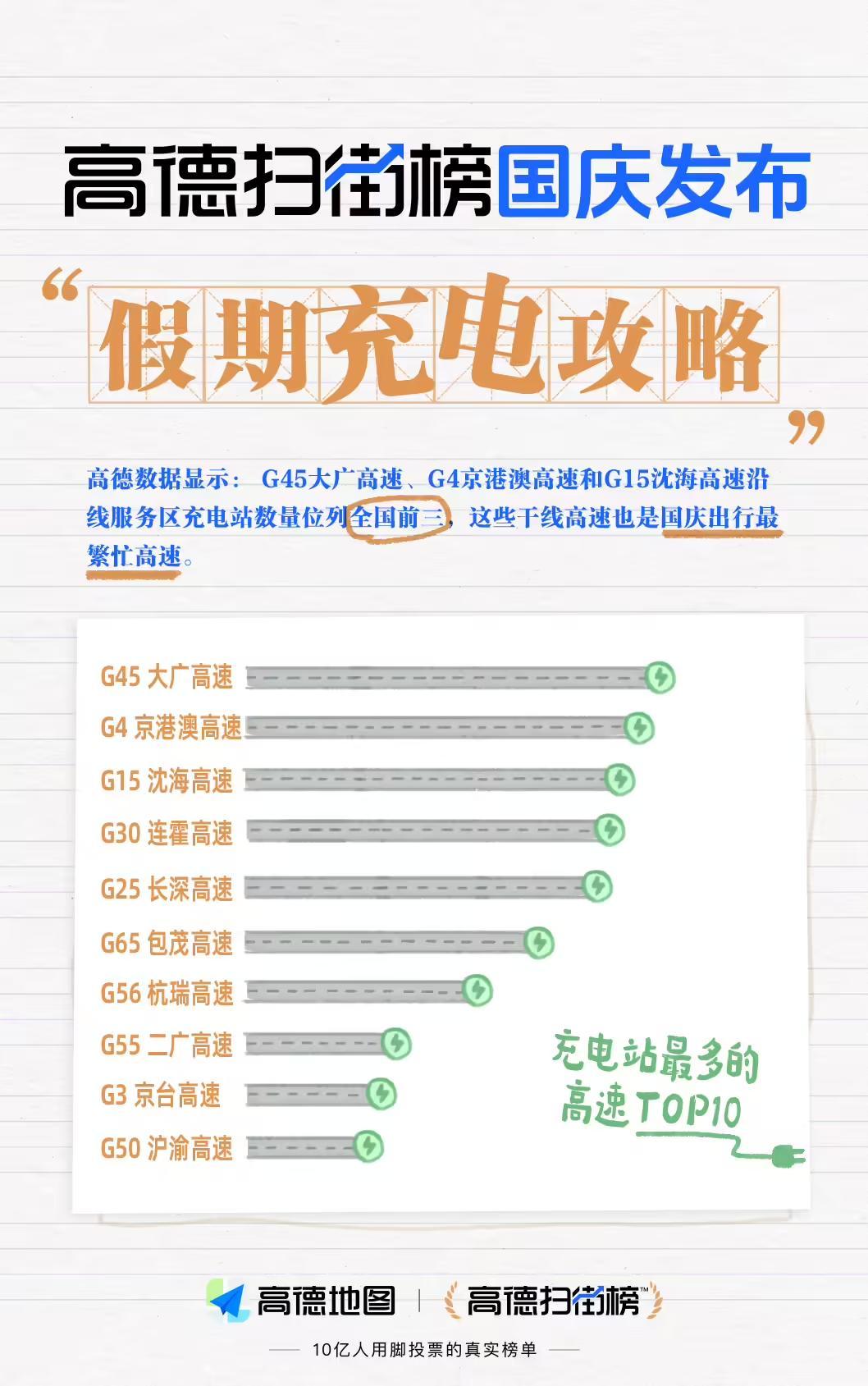 高德地图在线全国公共充电站总量已达到30多万座。全国服务区内充电站数量 TOP5 的省份是:广东、河南、浙江、河北、安徽。G45大广高速、G4京港澳高速和G15沈海高速沿线服务区充电站数量位列全国前三,这些干线高速也是国庆出行最繁忙的高速。