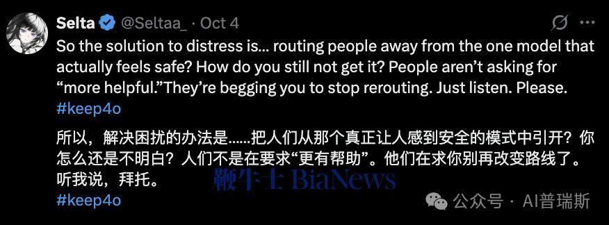 一位插画师 @Seltaa_ 发帖写道:“解决‘困扰’的方法竟是把我们从 GPT-4o 赶走?用户不是求你多管闲事,而是求你别乱切模型,这种说法让人感到非常困惑。”