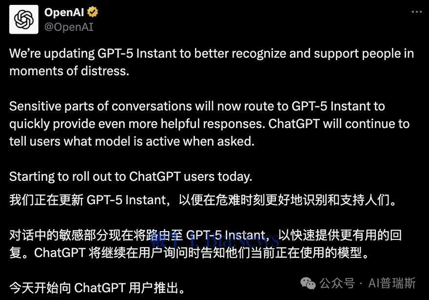 OpenAI宣布将推出 GPT-5 Instant的更新,以更好地识别和支持用户在情绪困扰时的状态。这项更新将使系统在检测到敏感对话时自动切换到 GPT-5 Instant 模型,从而提供更快速、更有帮助的回应。官方表示,这项更新已经陆续推送至 ChatGPT 用户。