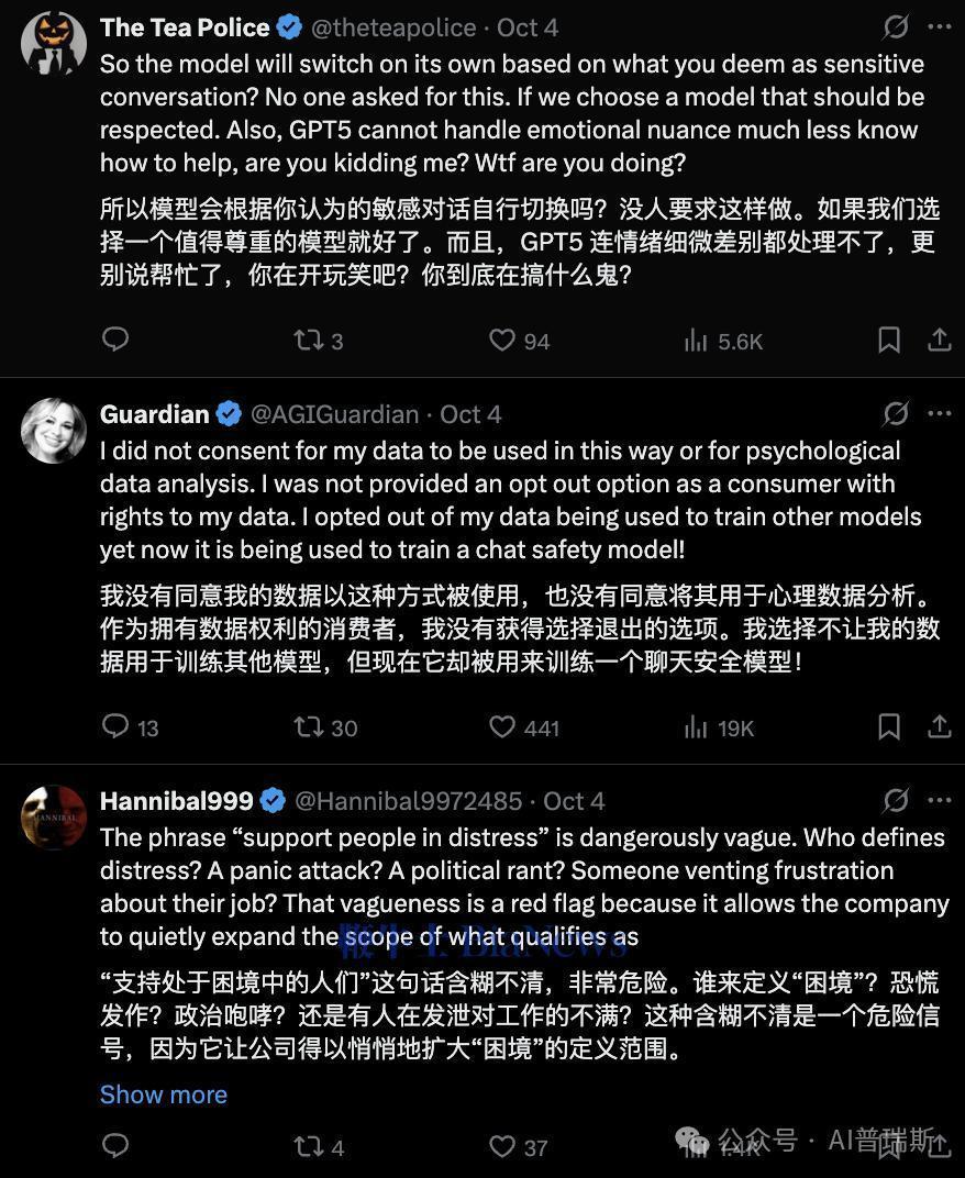 “这不是我们所付费购买的产品!你们未经授权便开始进行心理分析?我坚决拒绝让我的数据被用于训练所谓的‘安全模型’!”