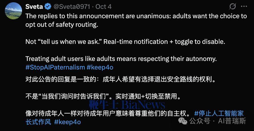 反对声浪中,最核心的不满在于——OpenAI没有提供关闭选项。用户@Claire呼吁:“别搞复杂,一键关闭就行!加个免责声明,风险我自己承担。成年人有选择权,不需要AI保姆。”