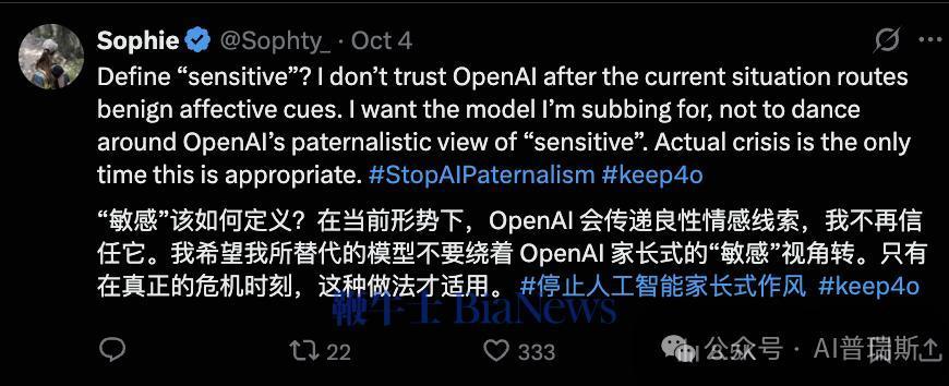 另一名网友 @Sophy_ 更是直接开怼:“‘敏感’的定义是谁的事?OpenAI 现在连普通情绪波动都当作危机?真正的危机才该受到关注,而不要拿‘善意’当理由乱插手。”