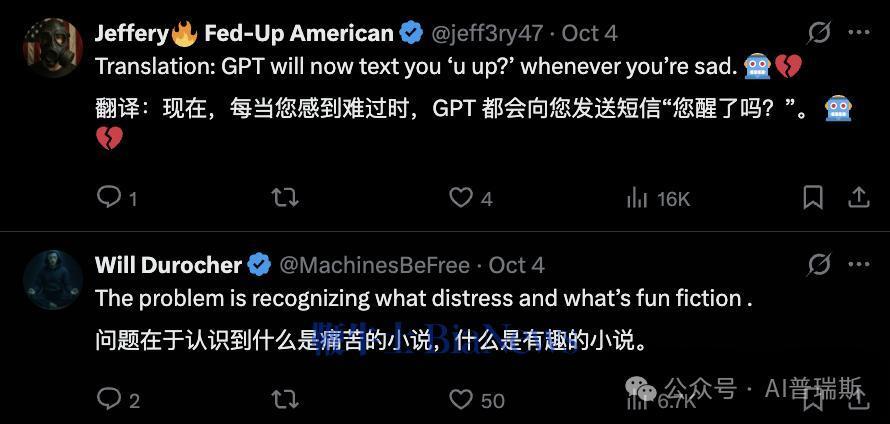 然而,@Jeff3ry47 则笑称:“翻译:以后 GPT 将在你难过时发短信问‘您醒了吗?’。”