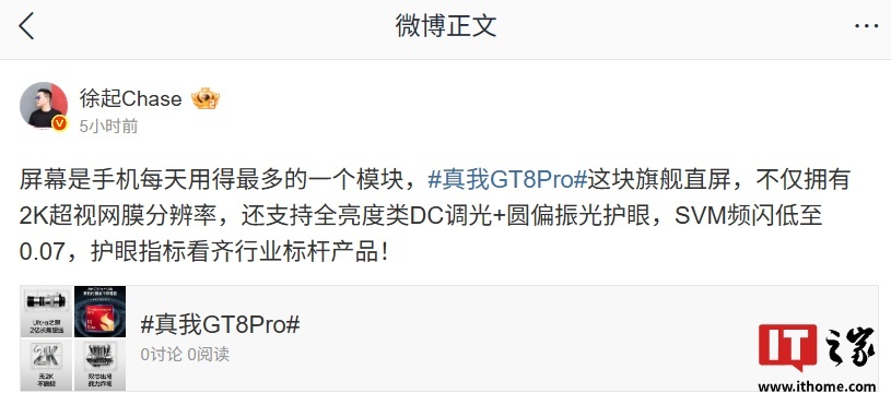 IT之家 10 月 5 日消息,真我 realme 副总裁、全球营销总裁、中国区总裁徐起今日发文指出,手机中最频繁使用的组件之一便是屏幕。根据他的透露,真我 GT8 Pro 手机的旗舰直屏拥有出色的 2K 超视网膜分辨率,同时还支持全亮度类 DC 调光 + 圆偏振光护眼,SVM 频闪 0.07,声称其“护眼指标达到了行业标杆产品的水平”。