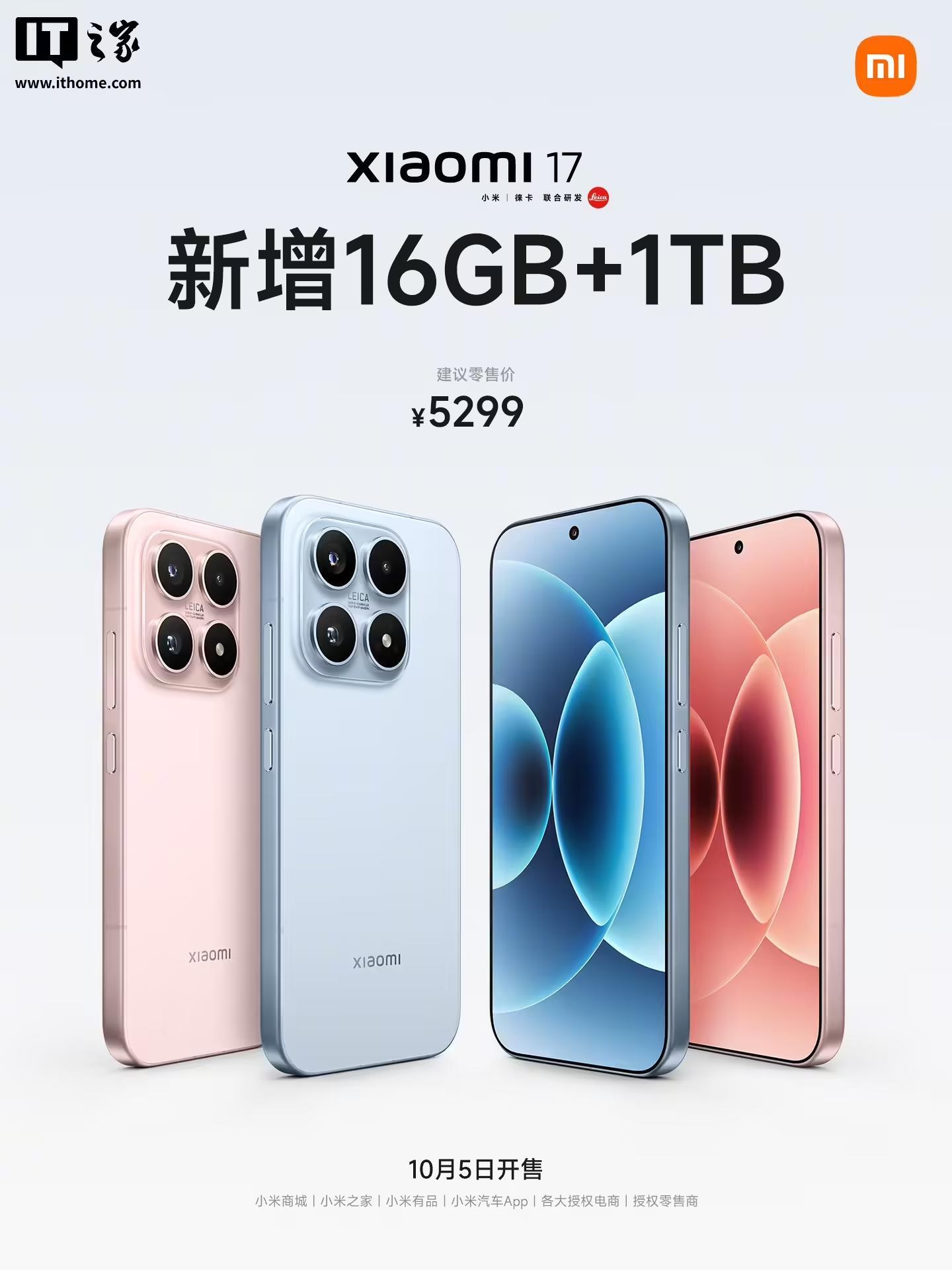 IT之家10月5日消息,小米17标准版手机16GB+1TB今日10点开售,搭载第五代骁龙8至尊版处理器、7000mAh电池,售价5299元。