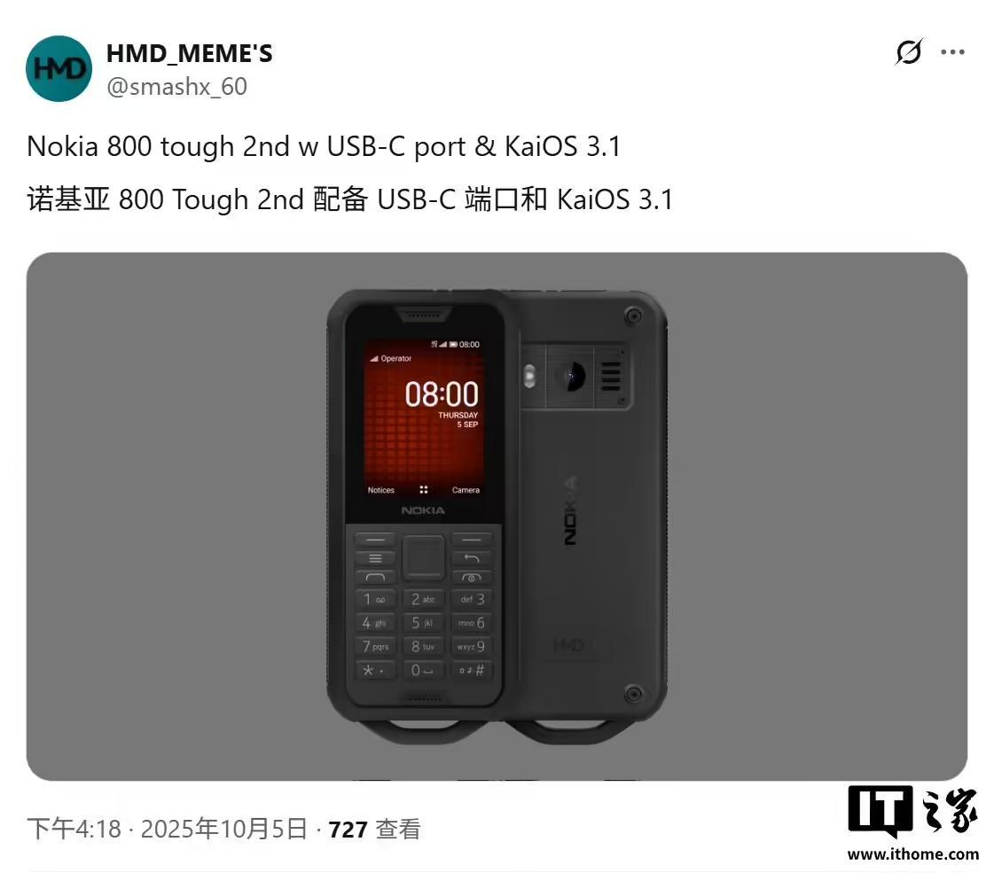 IT之家10月6日消息,消息源@smashx_60昨日(10月5日)在X平台发布推文,曝料称HMD Global计划更新诺基亚800 Tough三防功能机,在保留原版设计前提下,端口升级到USB-C接口,系统升级到KaiOS3.1版本。