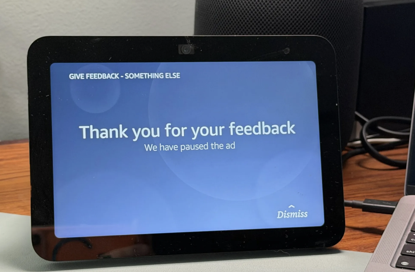 亚马逊发言人 Lauren Raemhild 回应 The Verge 称:“广告只是体验的一小部分,帮助用户发现可能感兴趣的新内容和产品。如果用户不喜欢某条建议,可以滑动跳到下一屏,或通过信息图标直接提供反馈”。然而,外媒发现,用户选择“反馈”关掉屏幕上的一条广告后,很快又出现了新的其他广告。这引发了用户对广告的疑虑和不满。