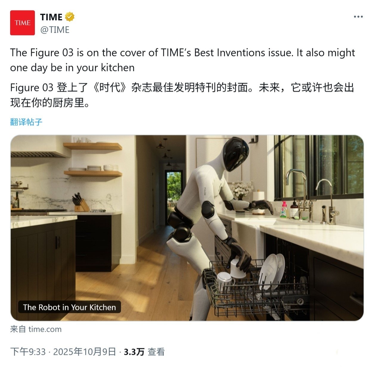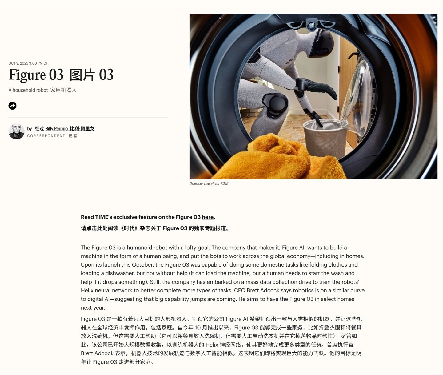 IT之家查询公开资料,发现 Figure 03 和 Unitree R1 等一起,入选为《时代》杂志2025年最具发明机器人榜单。