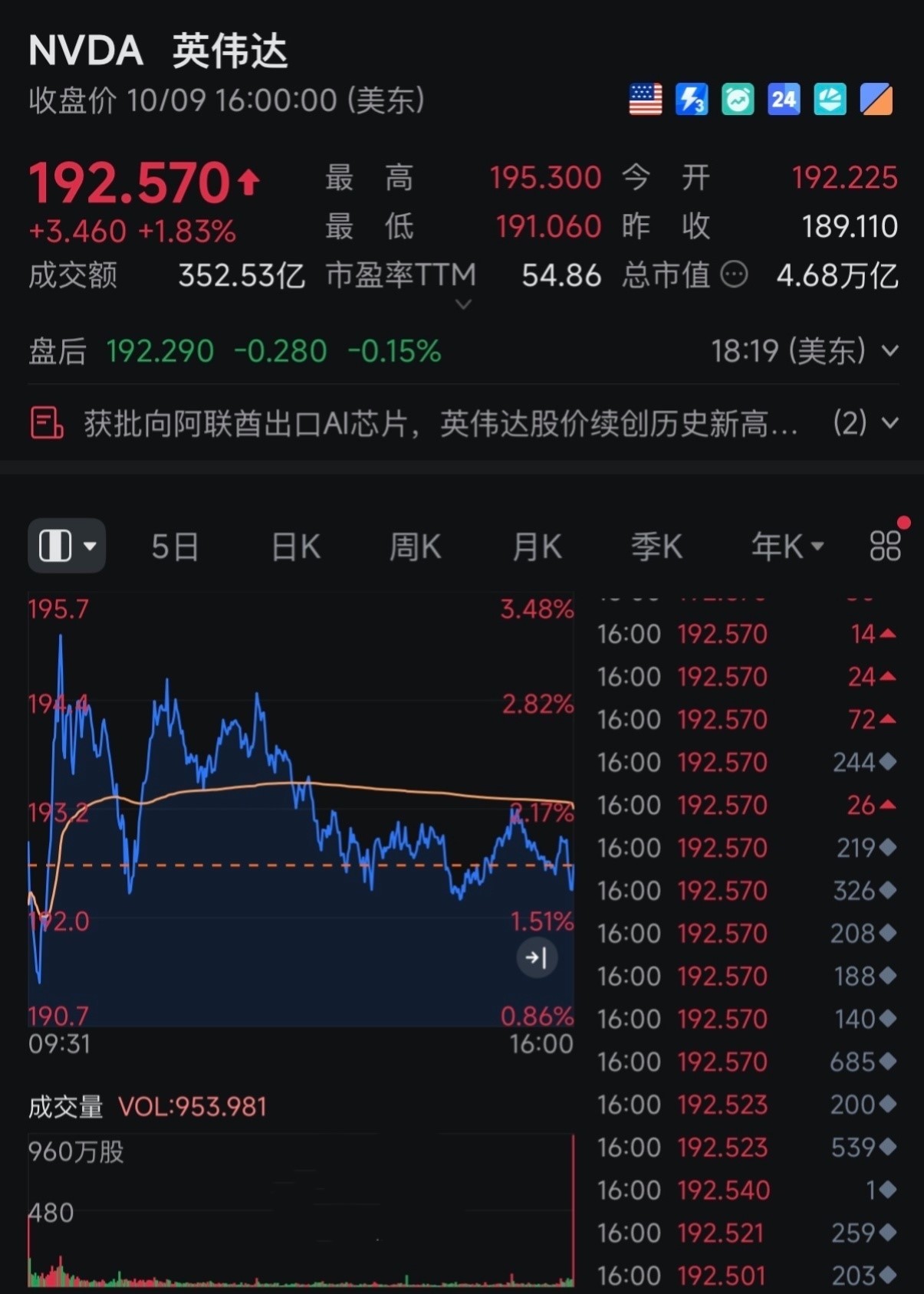 IT之家10月10日消息,英伟达股价昨日(10月9日,星期四)创下盘中与收盘历史新高,上涨至193美元,盘中涨幅超2.5%,市值逼近47万亿美元,成交额352.53亿美元。