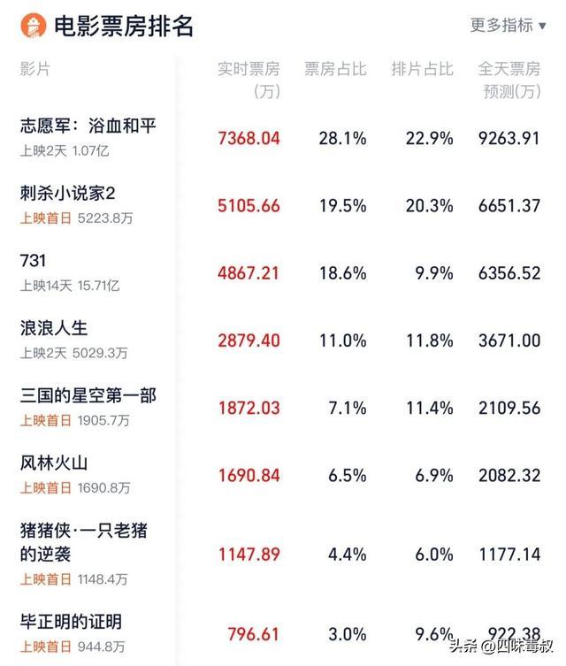 目前的当日票房及场次排名(只计入国庆档期间上映影片)分别是:《志愿军:浴血和平》、「《刺杀小说家2》」、「《浪浪人生》」、「《三国的星空第一部》」、「《风林火山》」、「《猪猪侠·一只老猪的逆袭》」和「《毕正明的证明》」。