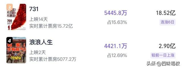 值得一提的是,在9月中下旬几乎处于排片垄断状态的电影《731》,本日在这两部电影上映后,单日票房及场次回落至第三位,但即便如此,该片本日票房仍然有望突破5亿元,最后的票房预测达18.52亿元(本日数据)。