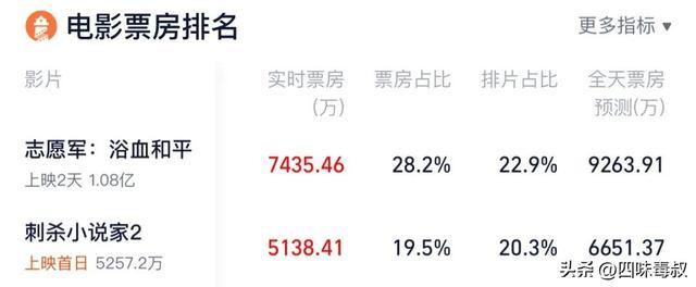 此外,上映前夕业界普遍看好的《刺杀小说家2》上映首日票房紧随《志愿军:浴血和平》之后,目前全国排片占比也在20%左右,较之后者的23%不相伯仲。