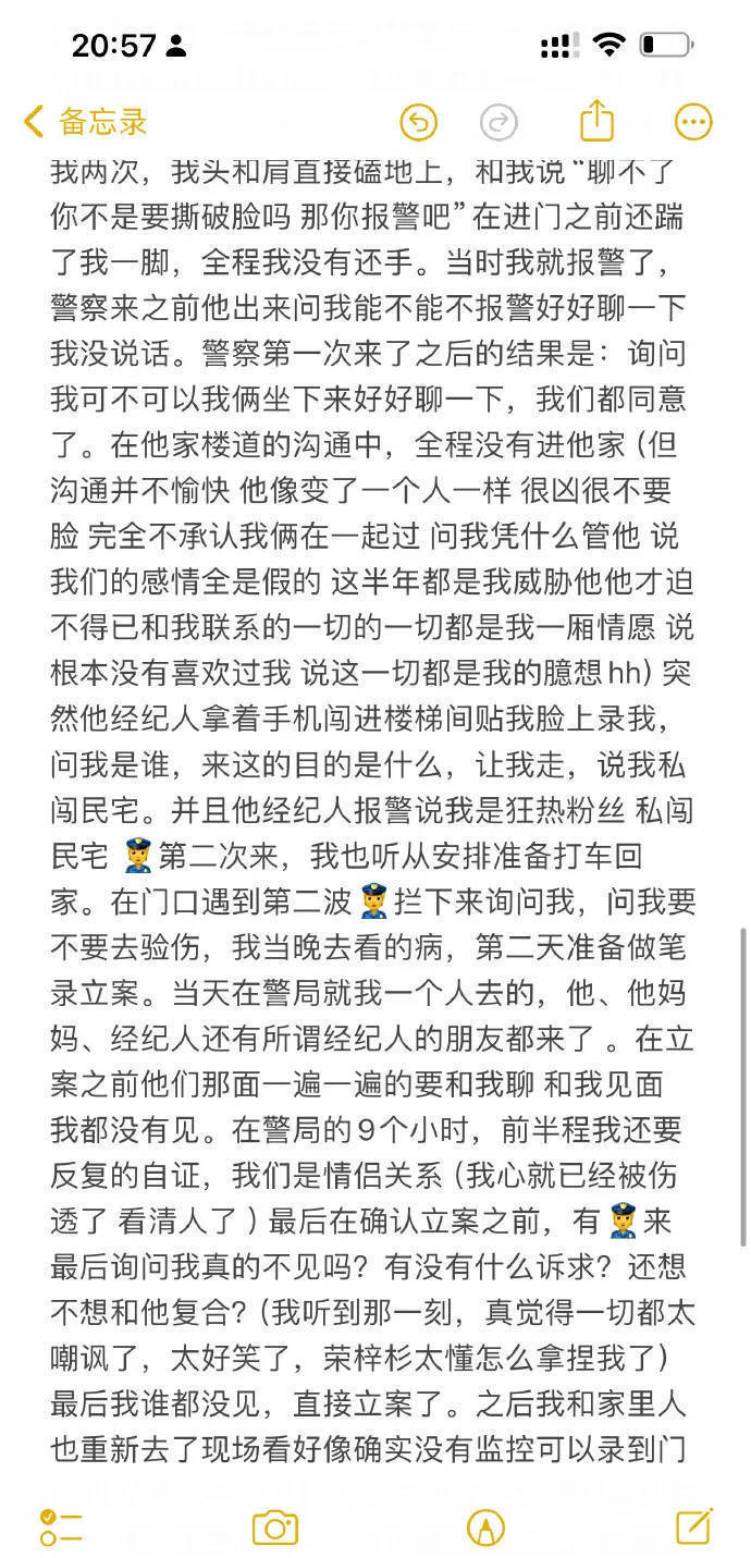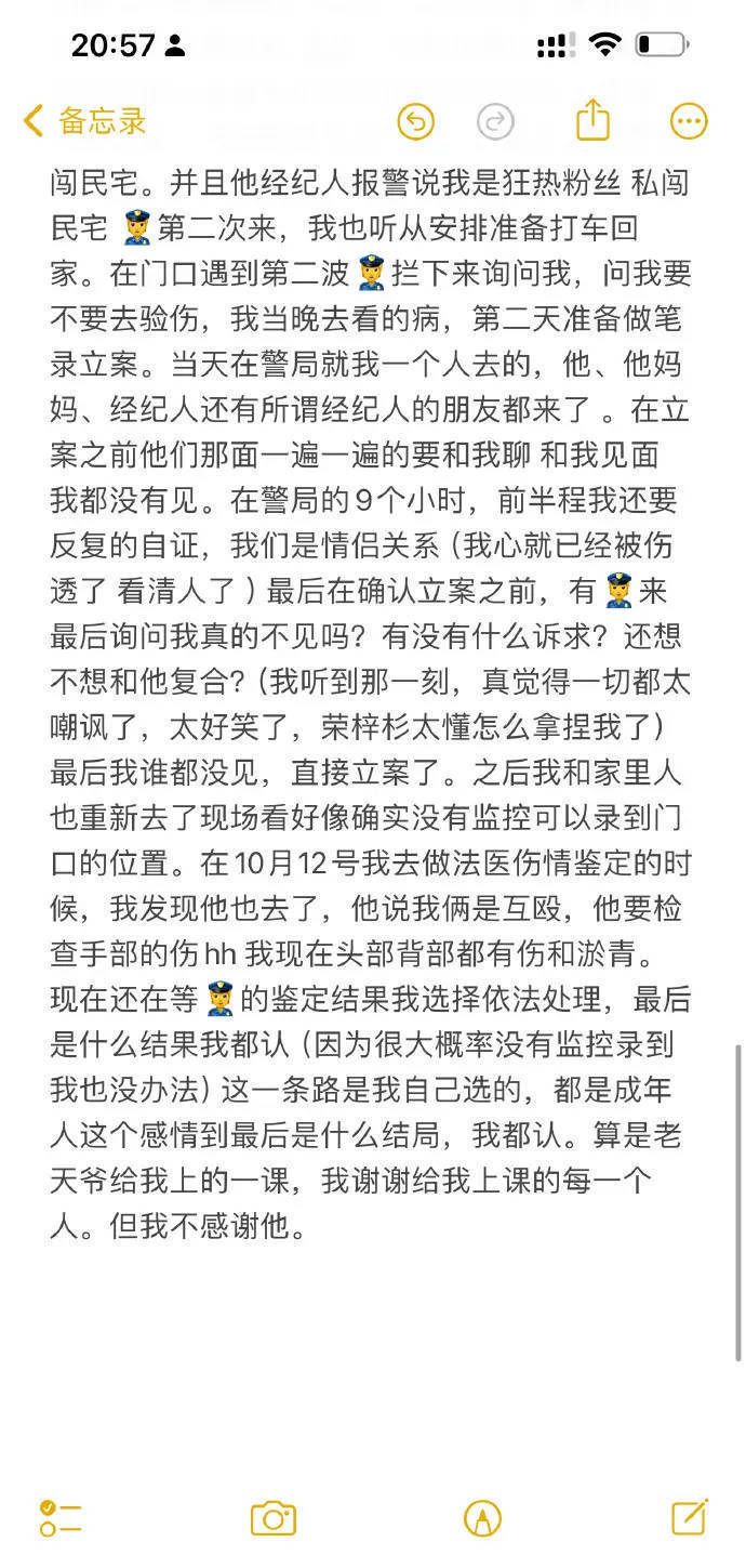 此外,李禹熹在文中还提及了荣梓杉曾经对她实施暴力行为的情况。为佐证自己的身心健康受到严重影响,她随文附上了相关的诊断证明。
