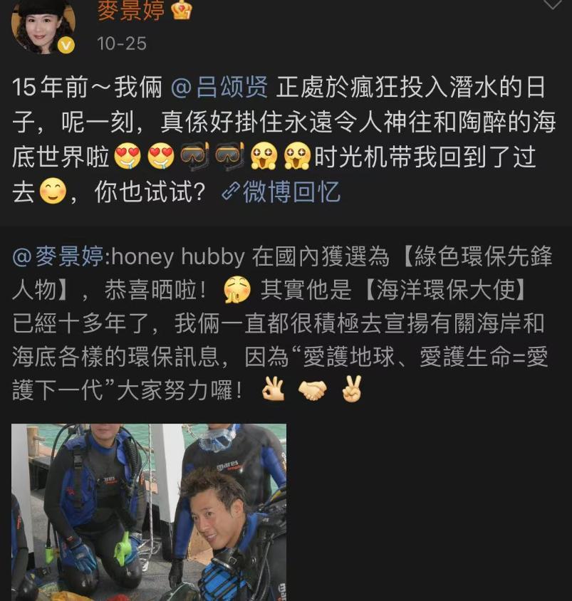 10月25日,麦景婷在微博上分享了一张十年前的照片,展现自己和吕颂贤的潜水回忆,还有不少网友纷纷夸赞两人。