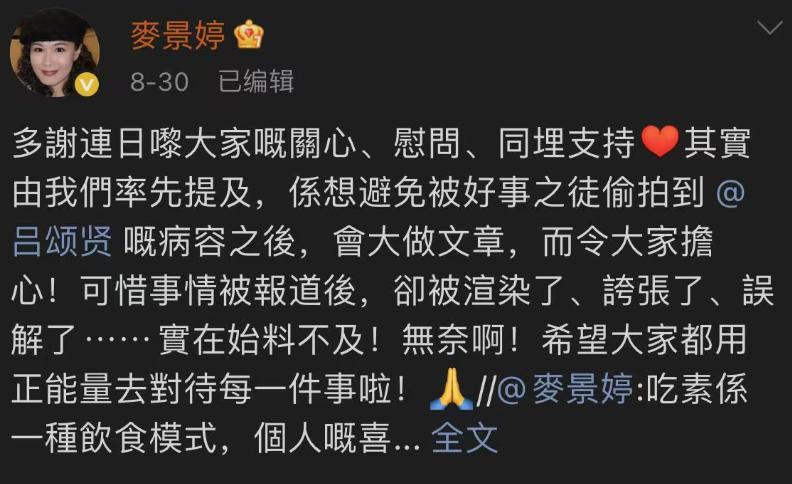 然而今年8月份的时候,吕颂贤因肺部感染差点就出险,在医院里待了很长时间才脱离危险。