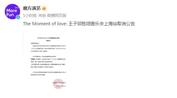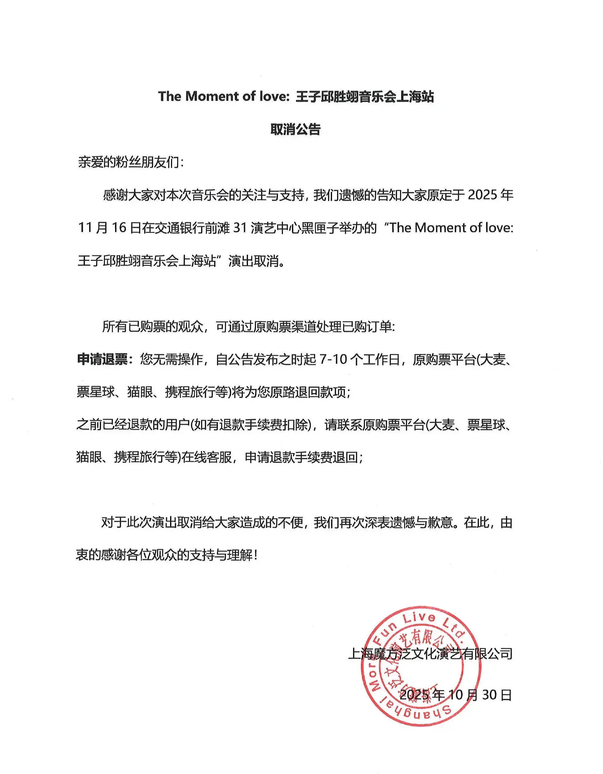 主办单位“魔方演艺”宣布公告:“我们遗憾地通知大家,原定于2025年11月16日举办的‘王子邱胜翊音乐会上海站’演出取消。所有已购票观众可通过原购票渠道办理退票。”
