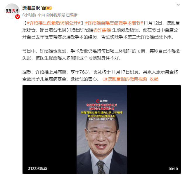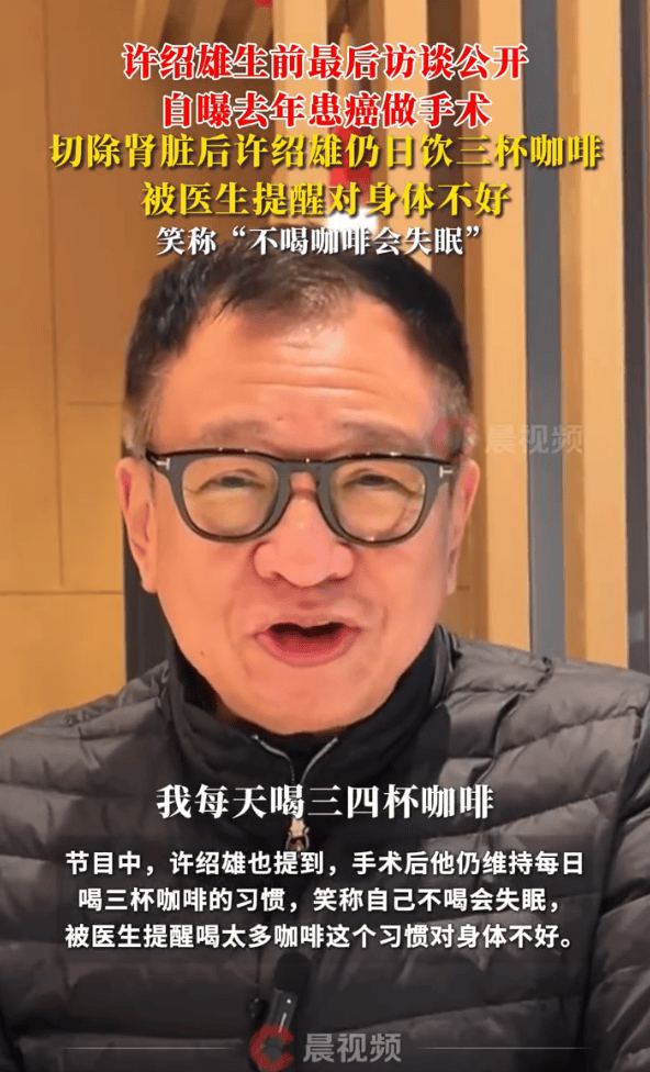 11月12日,许绍雄生前最后的访谈播出,他在节目中首次公开了自己去年患癌及接受手术的挑战经历。许绍雄坦言,手术后他仍然坚持每天喝三杯咖啡的习惯,虽然医生曾警告他过度喝咖啡对身体不良,但他坚持认为自己不喝咖啡就会失眠。