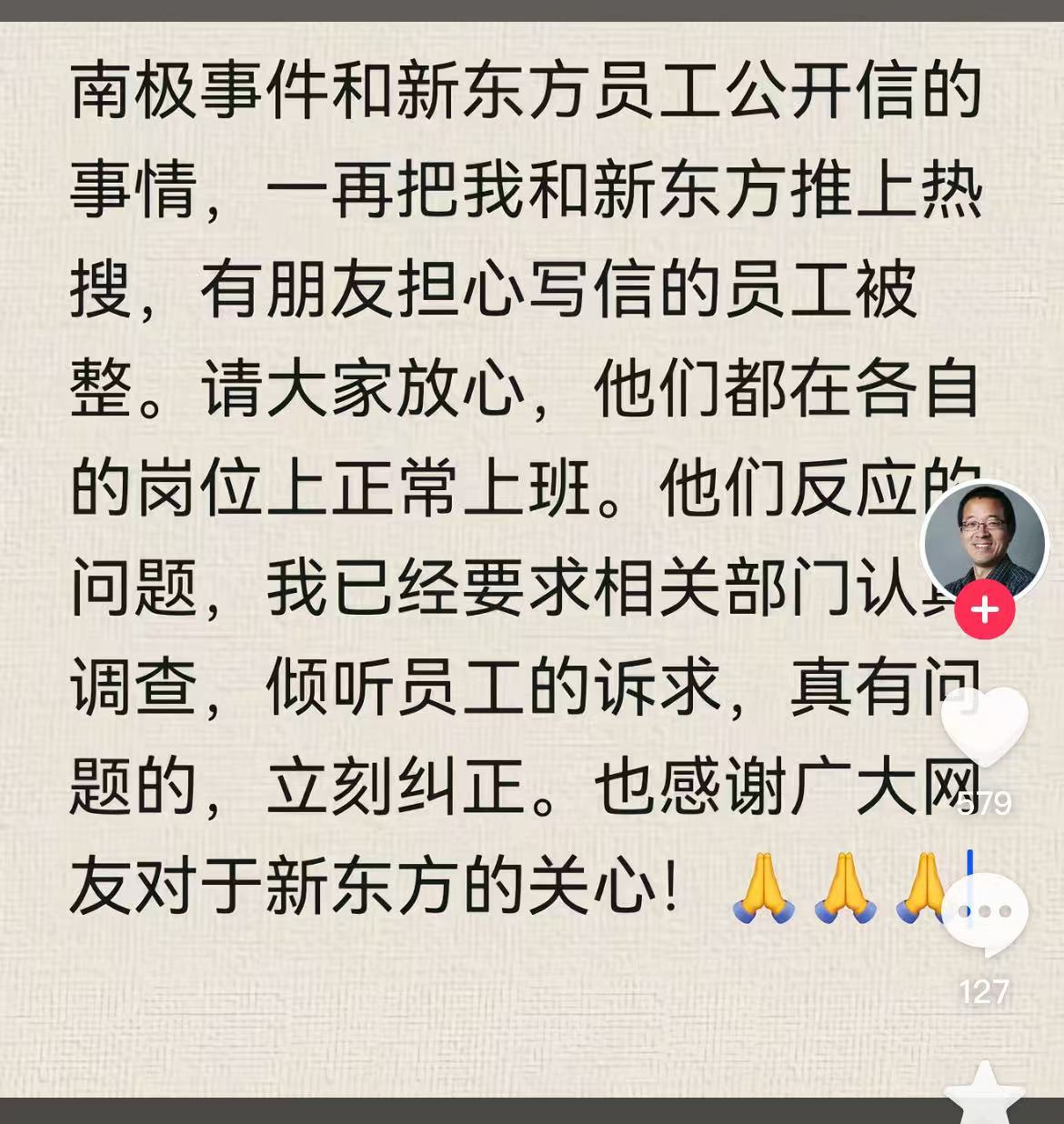 俞敏洪回应新东方员工公开信:已要求相关部门认调查,倾听员工的诉求