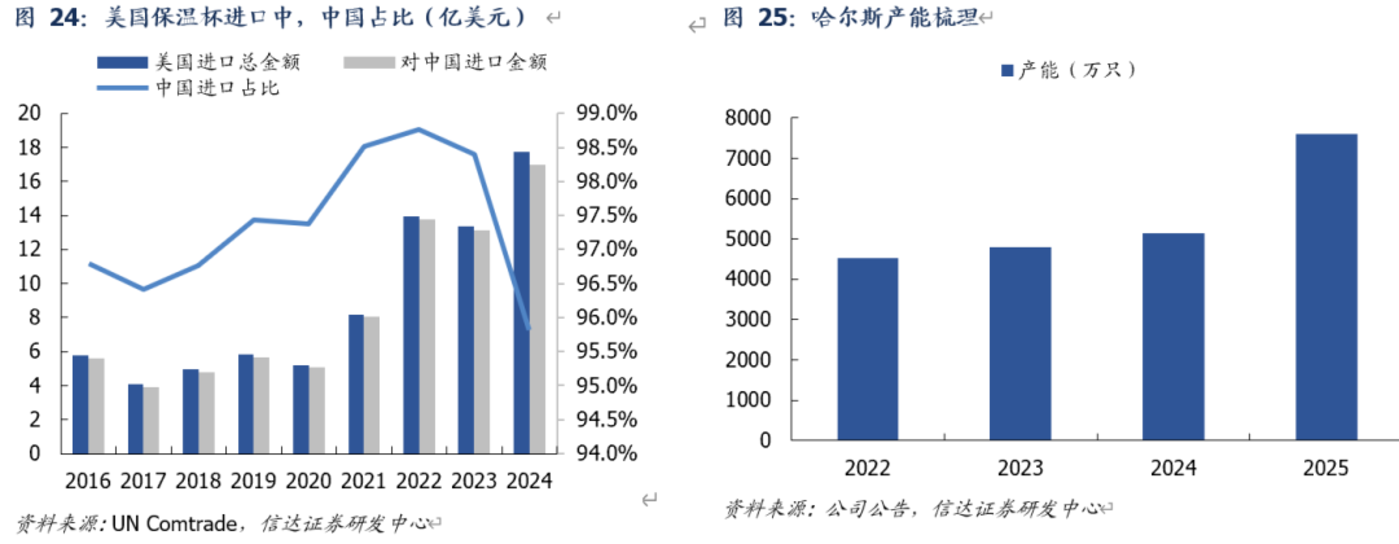 哈尔斯是中国杯壶行业第一家在海外布局产能的中国企业。2023年,泰国一期工厂正式投产,实现了550万只的产能生产;2025年,二期工厂的建设完成并投产,产能将达到2450万只。两期工厂的总产能设计达到3000万只,标志着哈尔斯在海外布局的成功。