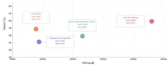 HY 2.0 Think 引入了精细的长度惩罚策略,巧妙地平衡了思维链的效率和效果,避免模型堆砌废话,以实现计算资源的更高效分配。通过对照 HY 2.0 Think 在 IMO-AnswerBench、HMMT2025、ARC-AGI 和 HLE 这四个权威推理任务上的表现,以及相应的 token 消耗,可以看到 HY 2.0 Think 在取得类似的准确率下,消耗的 tokens 数量更少,单位 token 的智能密度处于“业界领先水平”。