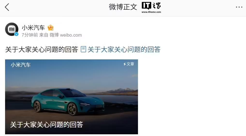 IT之家 4月1日消息,在“SU7高速碰撞爆燃”发生后,小米汽车今晚发布《关于大家关心问题的回答》。