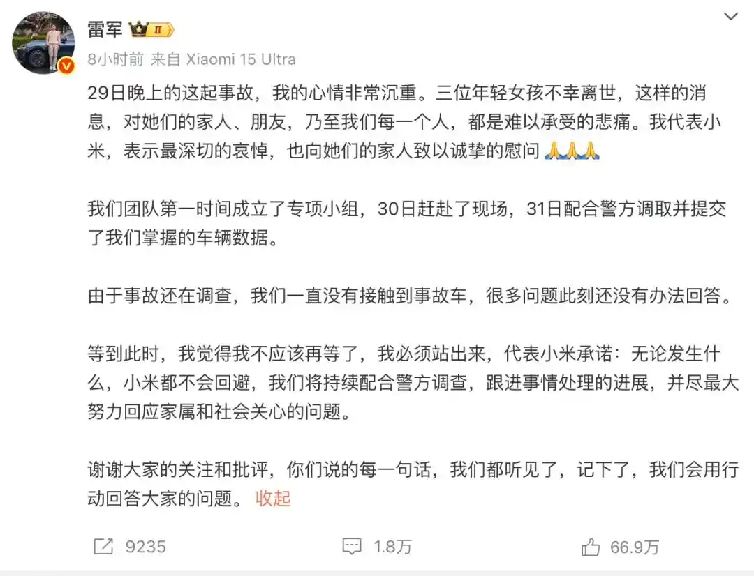 “小米SU7高速车祸致3死”事件持续热搜,4月1日晚,雷军以小米当家人的身份公开回应。