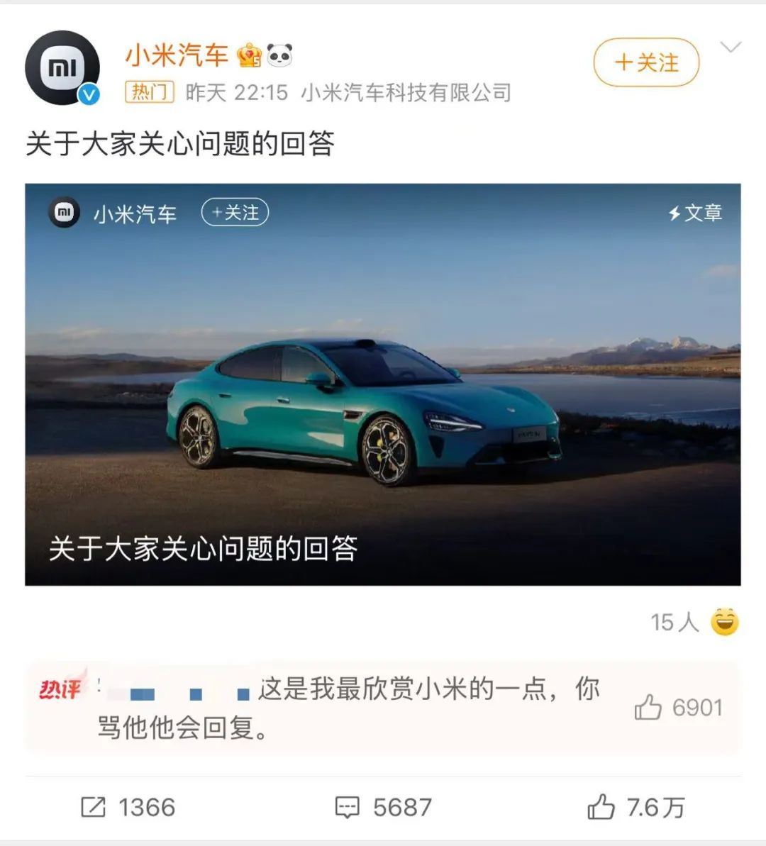 这些讨论里,不少业界人士关注的重点落在:雷军该不该立刻发声?雷军的回应是不是太晚了?这是一类“教大公司做公关”的技术性讨论。有网友在小米汽车“回答”下的一条高赞评论,可以作为答案:“这是我最欣赏小米的一点,你骂他,他会回复”。
