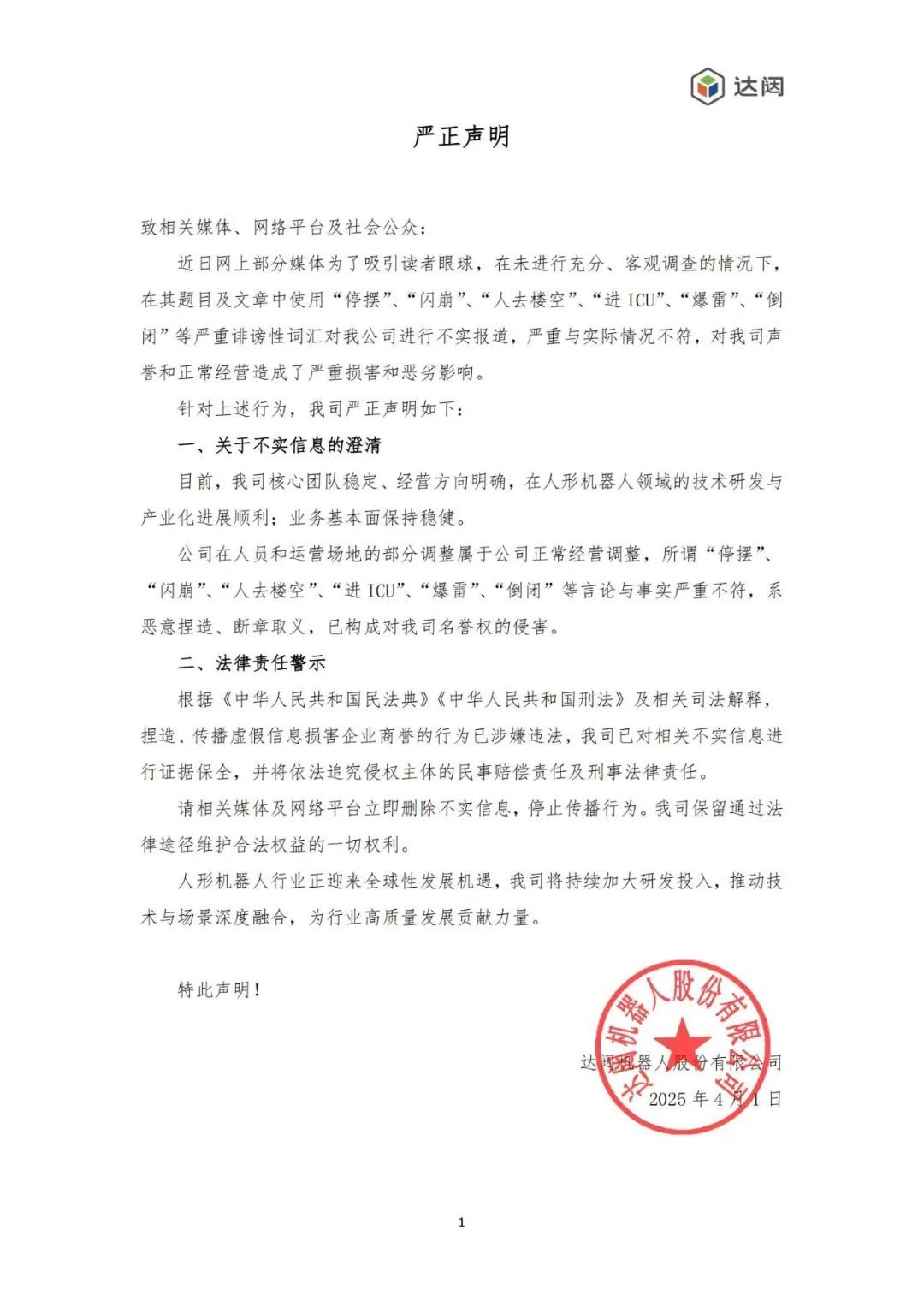 4月2日凌晨,达闼机器人在公众号发布声明,称公司核心团队稳定,业务基本面保持稳健。