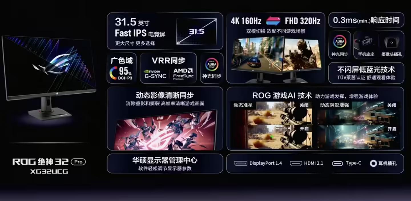 华硕推出“XG32UCG”32英寸显示器:4K 160Hz/FHD 320Hz双模,3999元