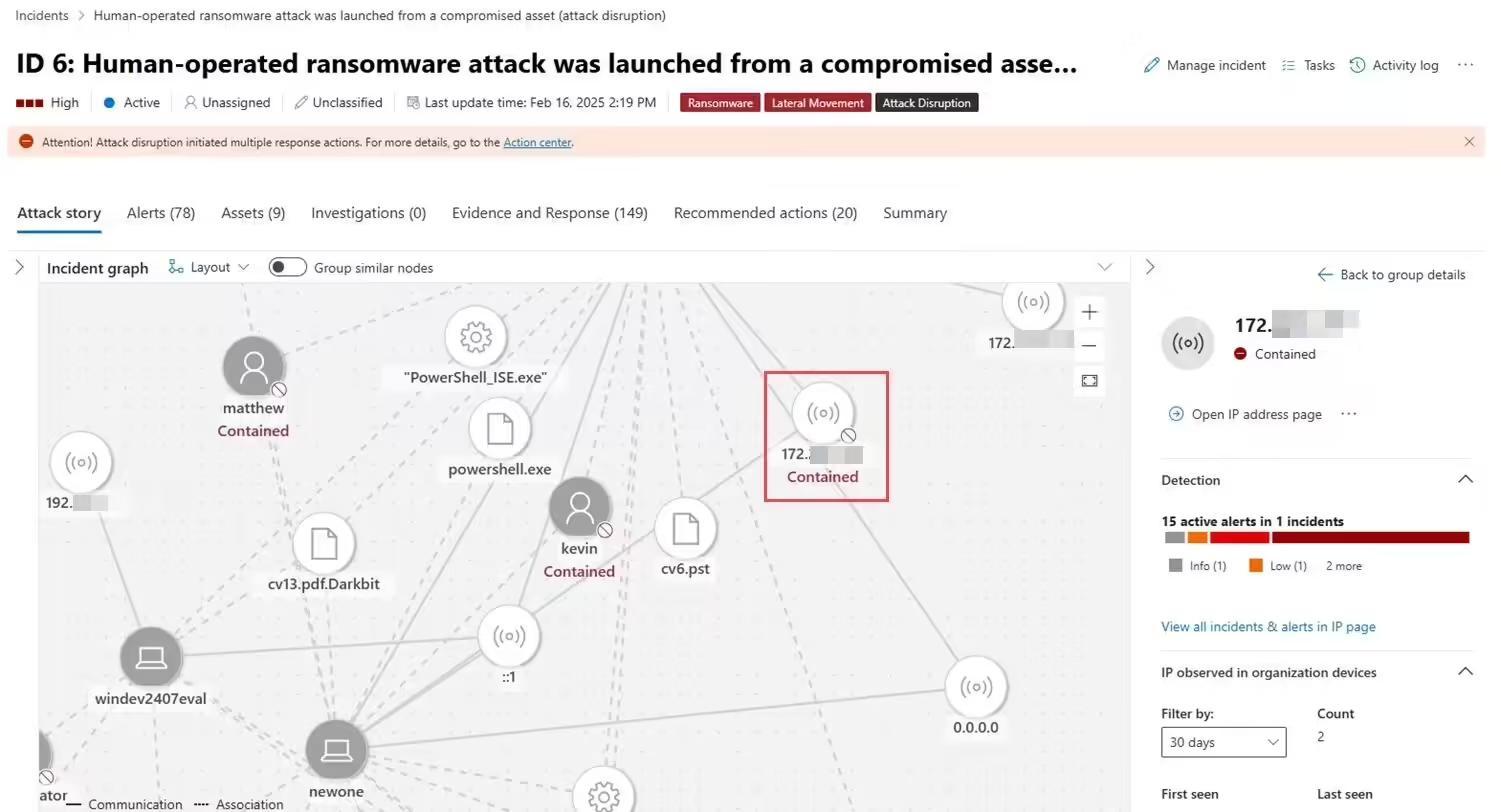 新功能依托“自动攻击中断”(automatic attack disruption)技术实现。在Defender for Endpoint检测到某个IP地址与未注册设备相关后,系统会自动触发“封锁 IP”策略,阻止该IP的恶意通信。