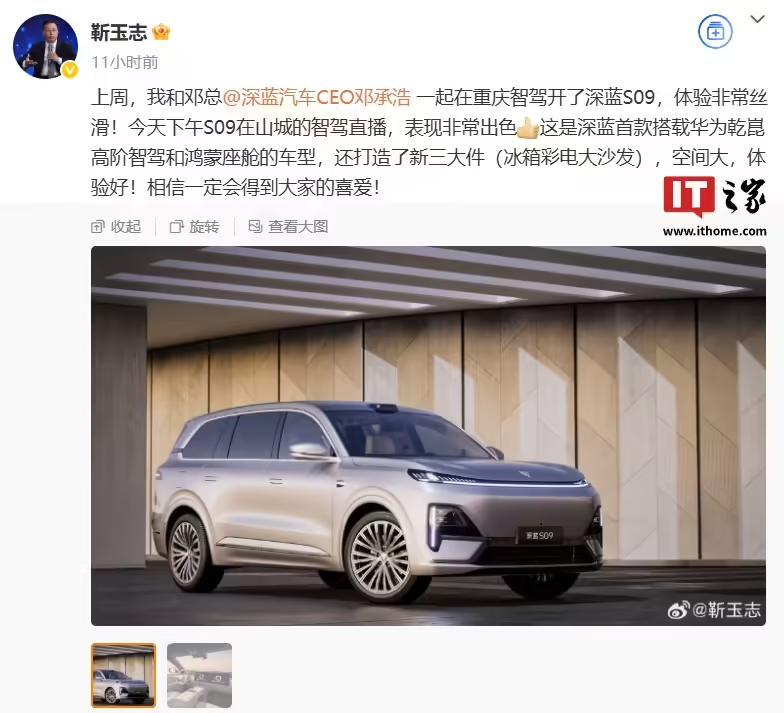 华为智能汽车解决方案BU CEO靳玉志表示,深蓝S09是深蓝首款搭载华为乾崑高阶智驾和鸿蒙座舱的车型,同时打造了新三大件(冰箱彩电大沙发)。