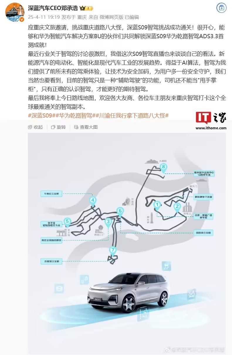 IT之家 4月12日消息,深蓝汽车CEO邓承浩昨日晚发文称,深蓝S09中大型SUV旗舰新车“重庆道路八大怪”智驾挑战成功通关。同时他透露,新车将搭载华为乾崑智驾ADS3.3。