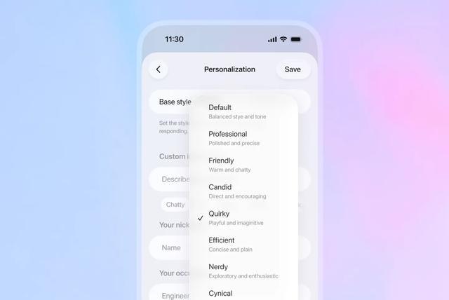 此次更新的另一大亮点,是OpenAI极大丰富了对话风格“个性预设”选项,用户如今可在“默认、专业、友好、坦率、古怪、高效、书呆子和愤世嫉俗”等多种个性之间灵活切换。OpenAI还宣布,将试验允许部分用户直接在设置中微调ChatGPT的语言风格,满足不同用户的个性化需求。