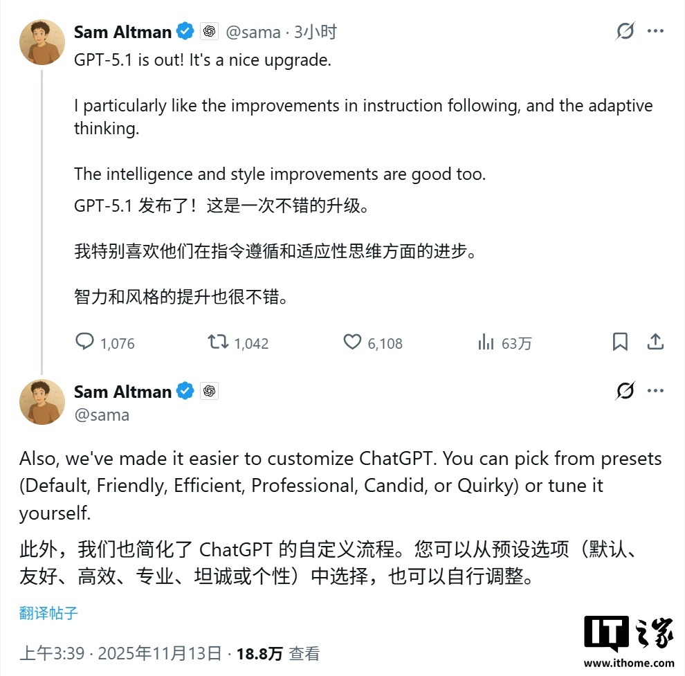 OpenAI奥尔特曼发布GPT-5.1系列:ChatGPT情商大涨,AI默认语气变“暖男”