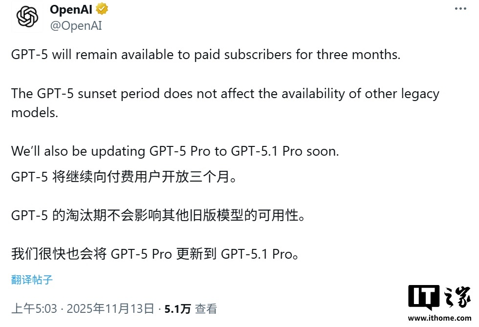 IT之家11月13日消息,OpenAI今日(11月13日)发布公告,宣布推出GPT-5.1系列旗舰模型,官方声称此次升级旨在“让ChatGPT更智能,对话体验更有趣”。新版本将从本周开始向用户推送,而旧的GPT-5模型将在三个月后被彻底取代。