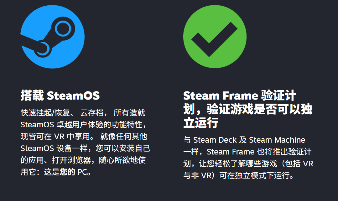 官网特别强调:Steam Frame 是一台功能强大的 PC,搭载由骁龙® 8 系处理器驱动的 SteamOS,提供出色的性能。它配备 16GB 内存,支持独立运行方式,能够畅玩 VR 与非 VR 游戏,而无需从 PC 上流式传输,且游戏的兼容性将不断上升。