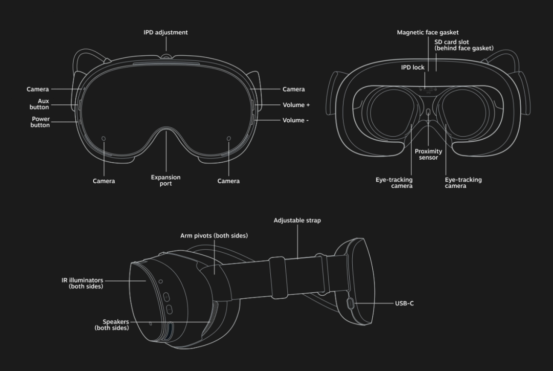 光学特性方面,头显采用定制的平铺式透镜方案,包括2160 x 2160 LCD面板,每眼各一,支持72-144Hz刷新率。