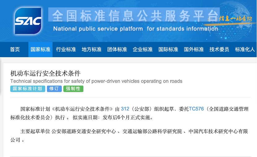 11月12日,根据全国标准信息公共服务平台官方消息,公安部牵头起草的国家标准《机动车运行安全技术条件》正式向社会公开征求意见。这份标准的主要起草单位包括公安部道路交通安全研究中心、交通运输部公路科学研究院和中国汽车技术研究中心有限公司。该标准拟在征求意见稿发布后6个月内正式实施,取代现行的GB 7258标准。