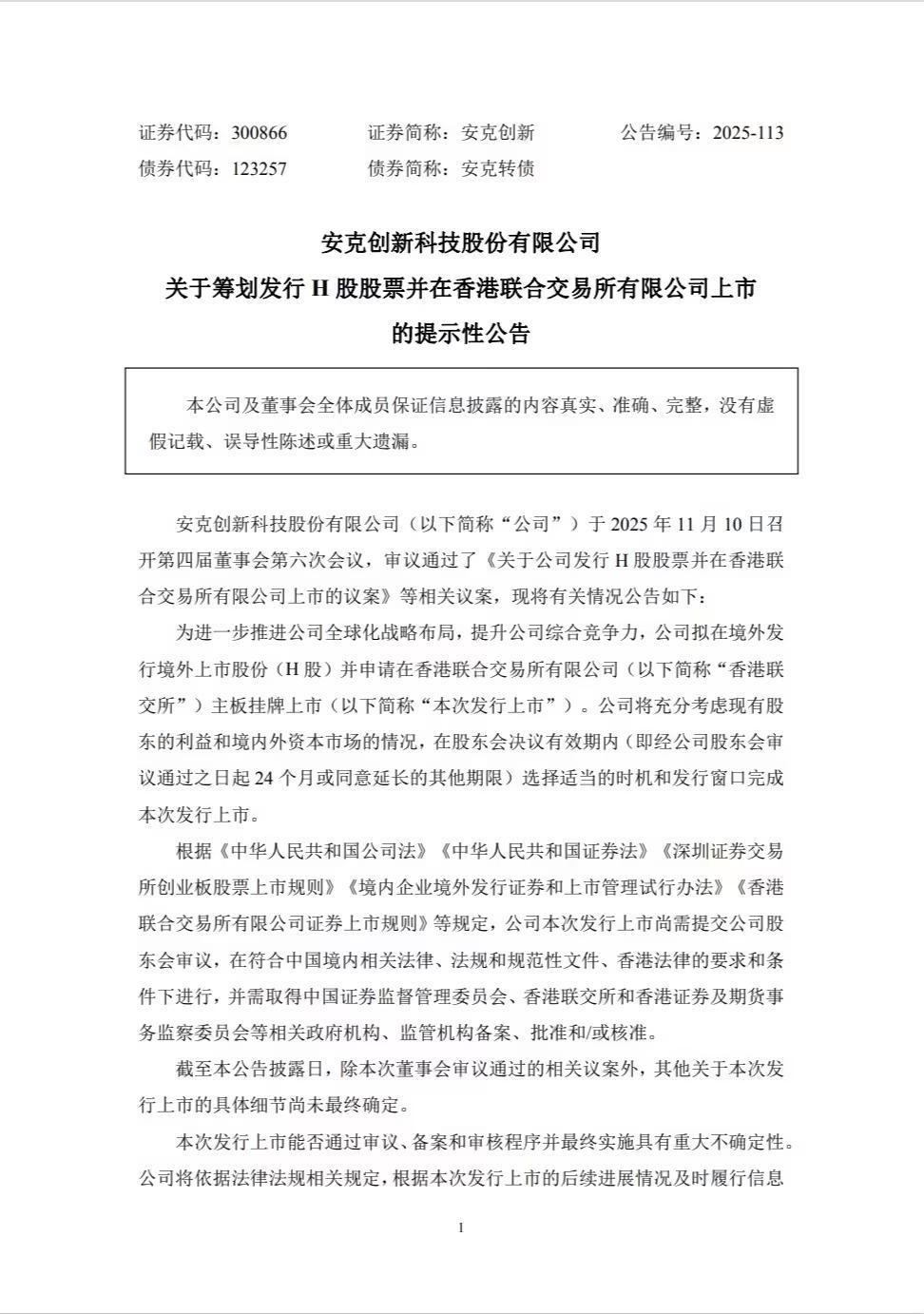 科技讯,11月13日,安克创新昨日在深交所发布公告,宣布拟在境外发行境外上市股份(H股),并申请在香港联合交易所有限公司主板挂牌上市。公司将悉心考虑现有股东的利益和境内外资本市场的情况,在股东会决议有效期内(即经公司股东会审议通过之日起24个月或同意延长的其他期限)选择适当的时机和发行窗口完成本次发行上市。