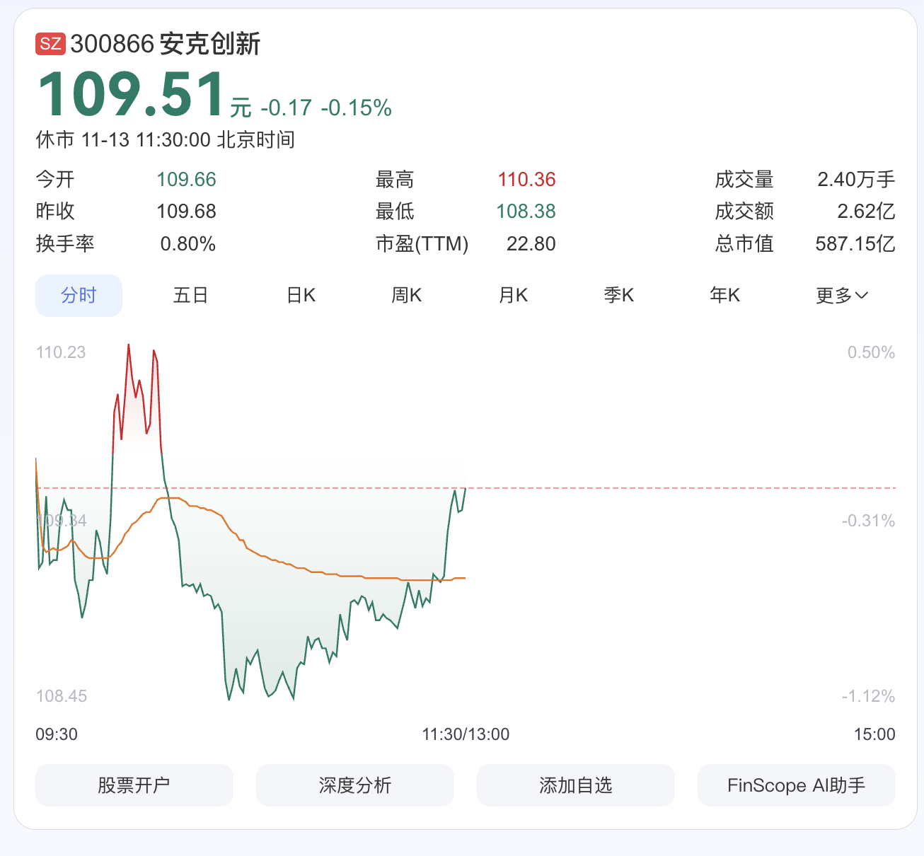 公告发出后,安克创新股价一度攀升至每股110.36元,截至发稿,股价报109.51元/股,总市值达587.15亿元。